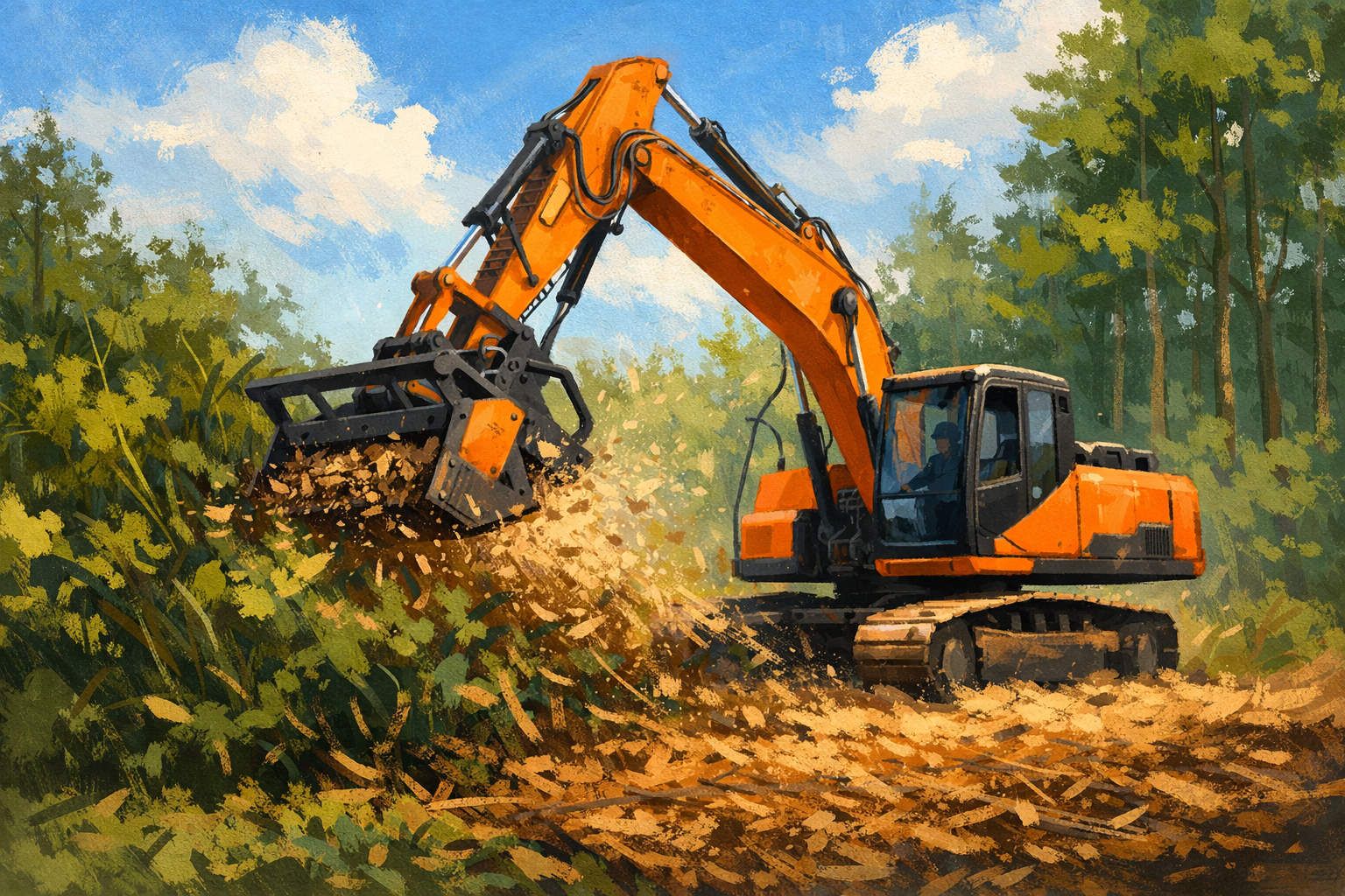 Our Kubota KX080-5 excavator paired with a Brown Raptor mulching head lets us clear thick brush, saplings, and small trees efficiently while keeping disruption to your property low.
